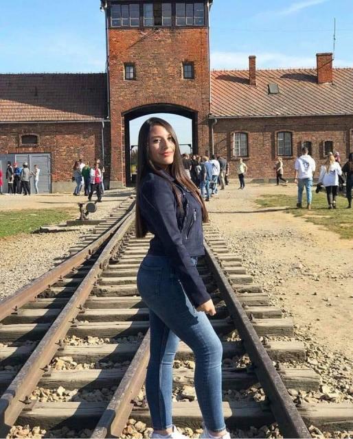| Turista posando en las vías del ferrocarril en la entrada al campo de concentración de Auschwitz II (Birkenau) |